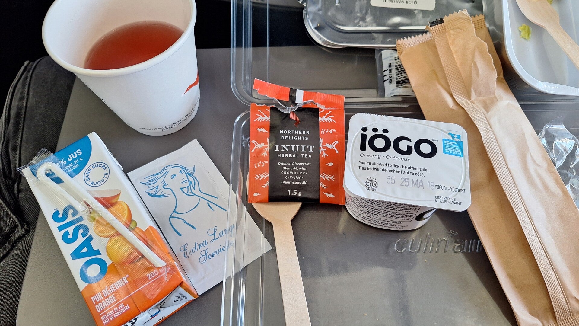As we climb above the clouds, the outside view clears up. No more snow, no more deicing fluid, just a beautiful sight of that classic engine purring along. It’s exhilarating! Meanwhile, the crew begins prepping the cabin for breakfast, which we actually had not expected. On flights with lesser-known airlines or remote routes, we’ve learned to expect zero catering. That’s why we packed our own snacks for today. So, Air Inuit surprises us with a full hot breakfast! We're served a warm quiche with potatoes and bacon, a juice box, a cup of tea (or another drink of choice), and even a little yogurt. Honestly, we’re blown away. We’re not even halfway through the first of four flights, and Air Inuit is already exceeding all expectations.