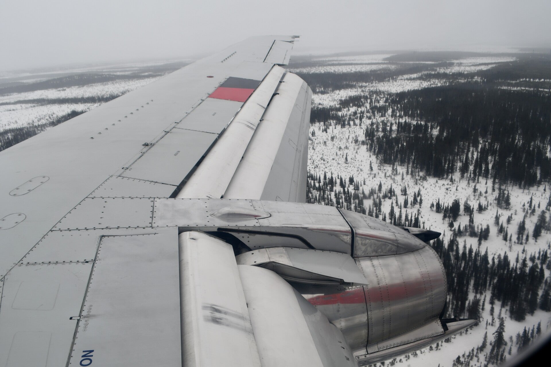 As we begin our descent, we pass through the clouds again, or at least, I think we do. It’s almost impossible to tell. We’ve flown above the tree line, so there’s nothing below us but an endless expanse of frozen lakes and snowy islands. The landscape is so uniformly white that it feels like staring at a blank sheet of printer paper. There’s no sense of depth or altitude. It’s easy to see how this terrain could be deceptively dangerous for low-flying aircraft.
