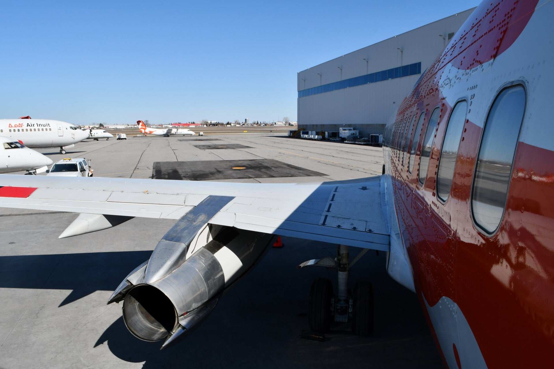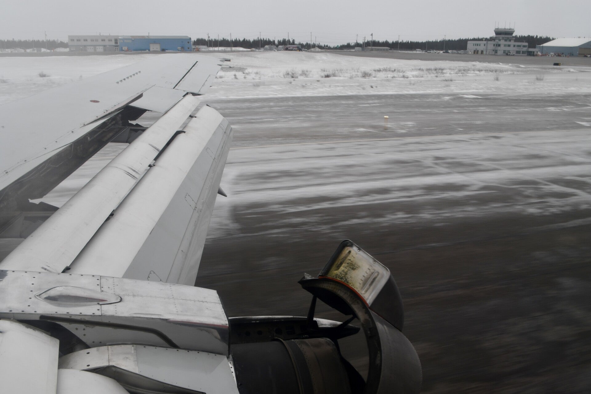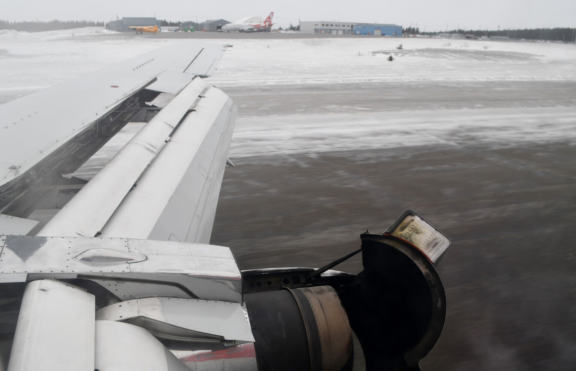 We push back and hear the JT8D-17 engines coming to life. The pushback tug and towbar are disconnected and with a scream of the engines the vintage 737 starts to roll. Meanwhile, the cabin crew performs the safety briefing, not once, not twice, but three times: first in English, then in French, and finally in Inuktitut, the local Inuit language. Watching them perform the full demo in all three languages is a refreshing change, something even major multilingual airlines don’t always do.