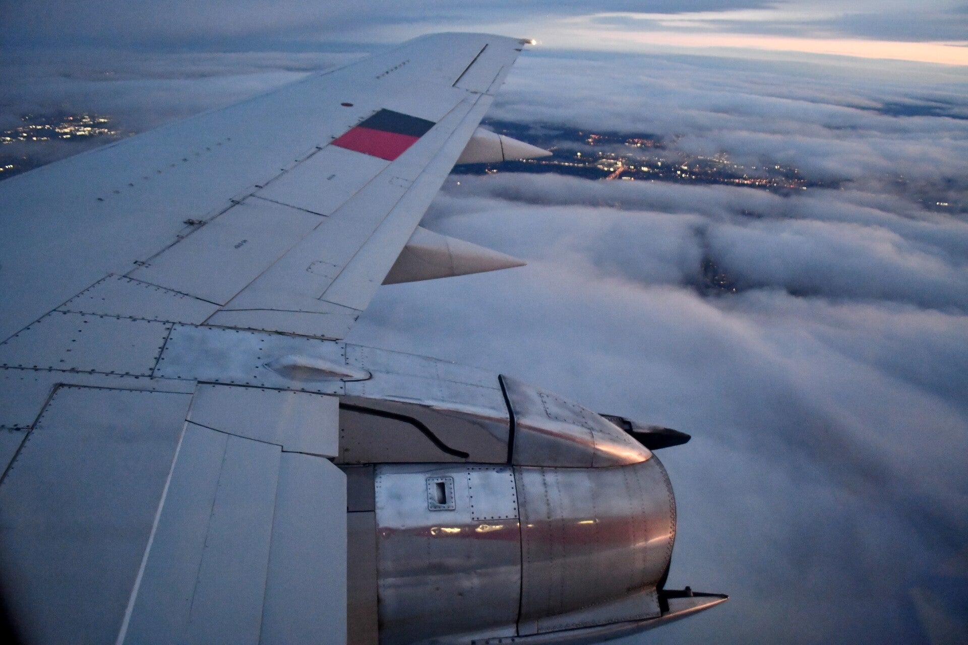 Ah well, at least we have a great view of the mighty Rolls-Royce RB211-535E4C engines. We depart right on time from runway 17R, offering a great view of the airport as we climb. The skies are clear for a while, but by the time we reach Charleston, we’re back above the clouds.