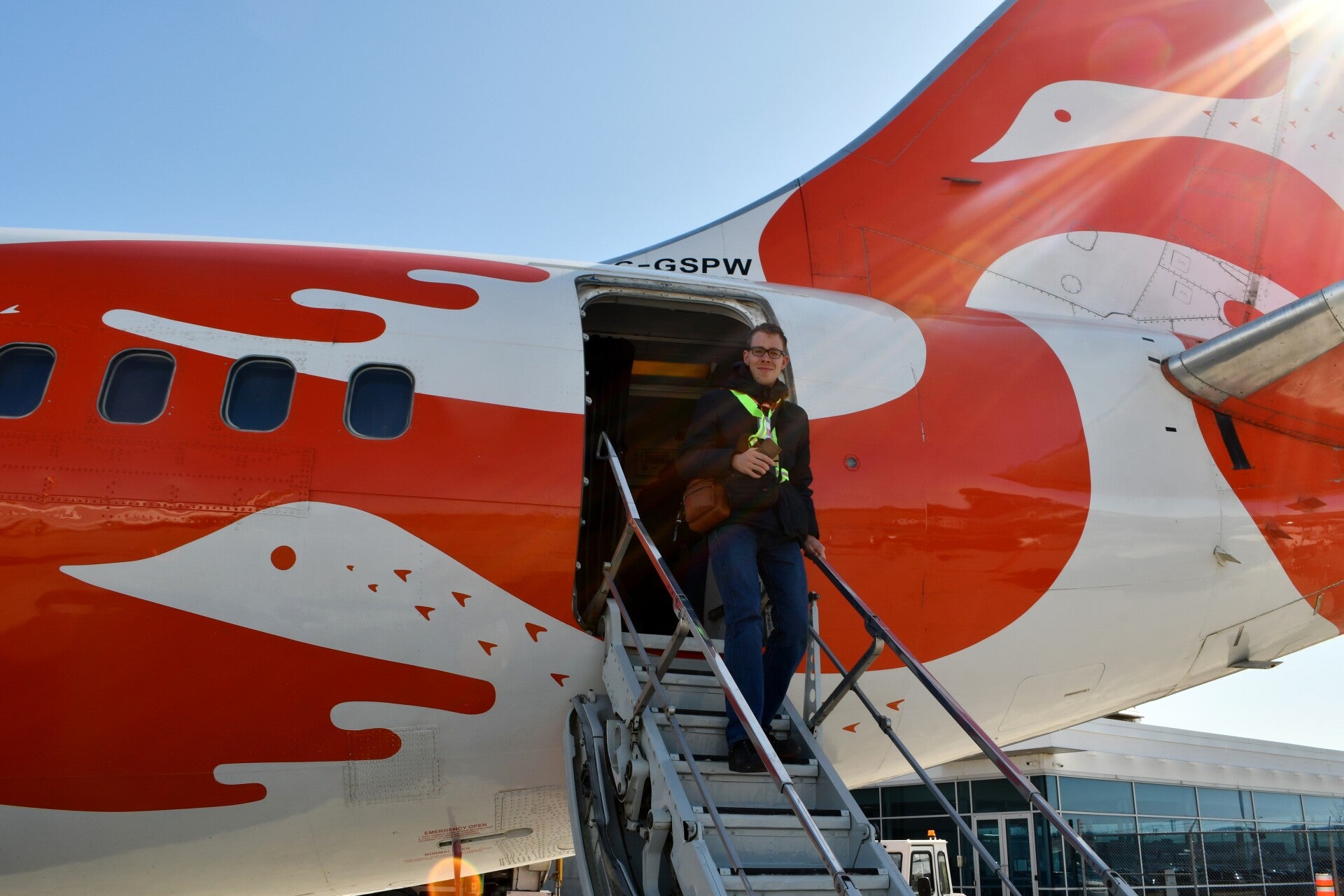 We wait patiently while the rest of the passengers deplane, which takes a little while since only the rear stairs are being used. Once the last passenger has stepped off, it’s time for our behind-the-scenes tour. Maxime, true to his word, leads us out onto the ramp. Lewis conveniently tags along, taking full advantage of our pre-arranged access.