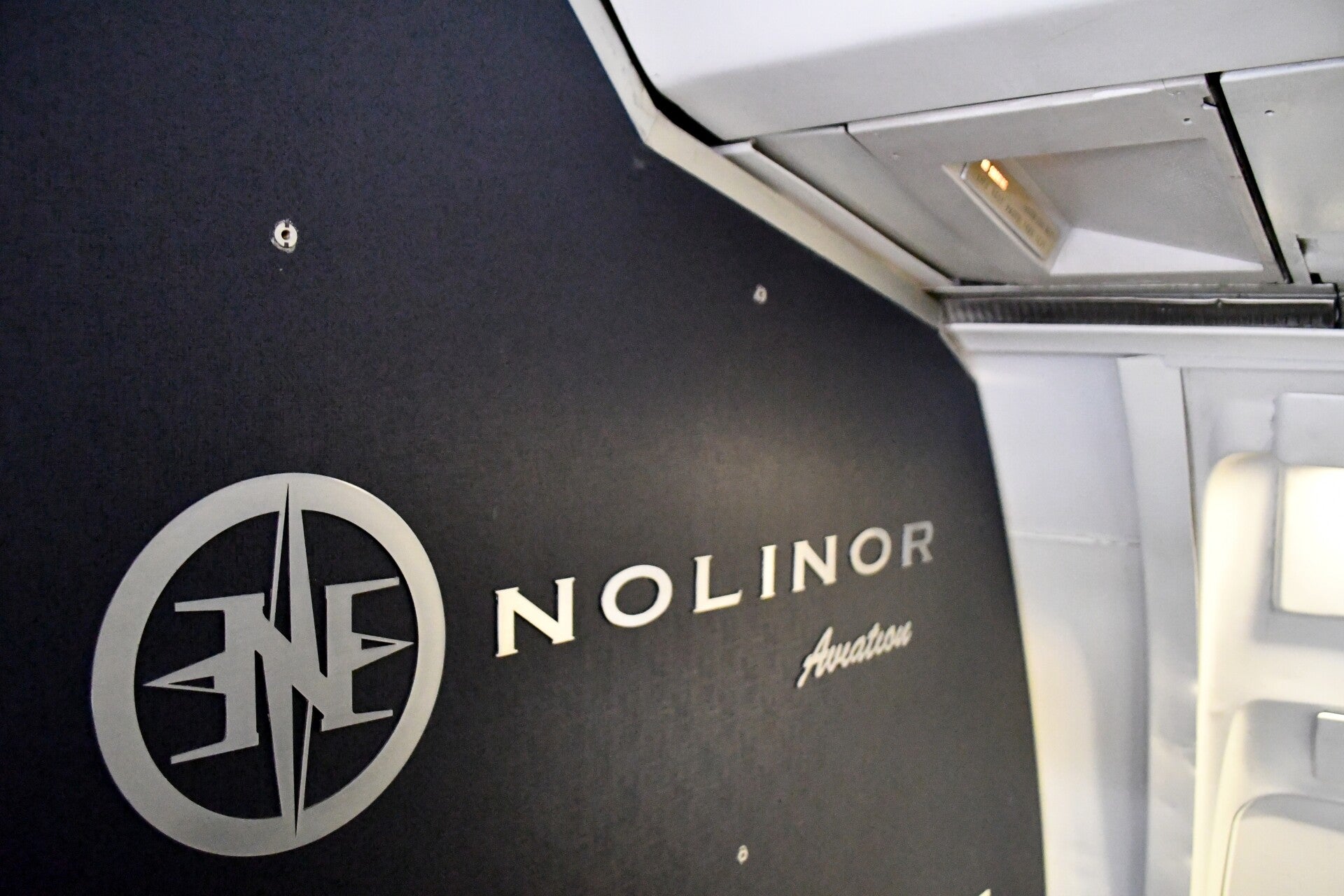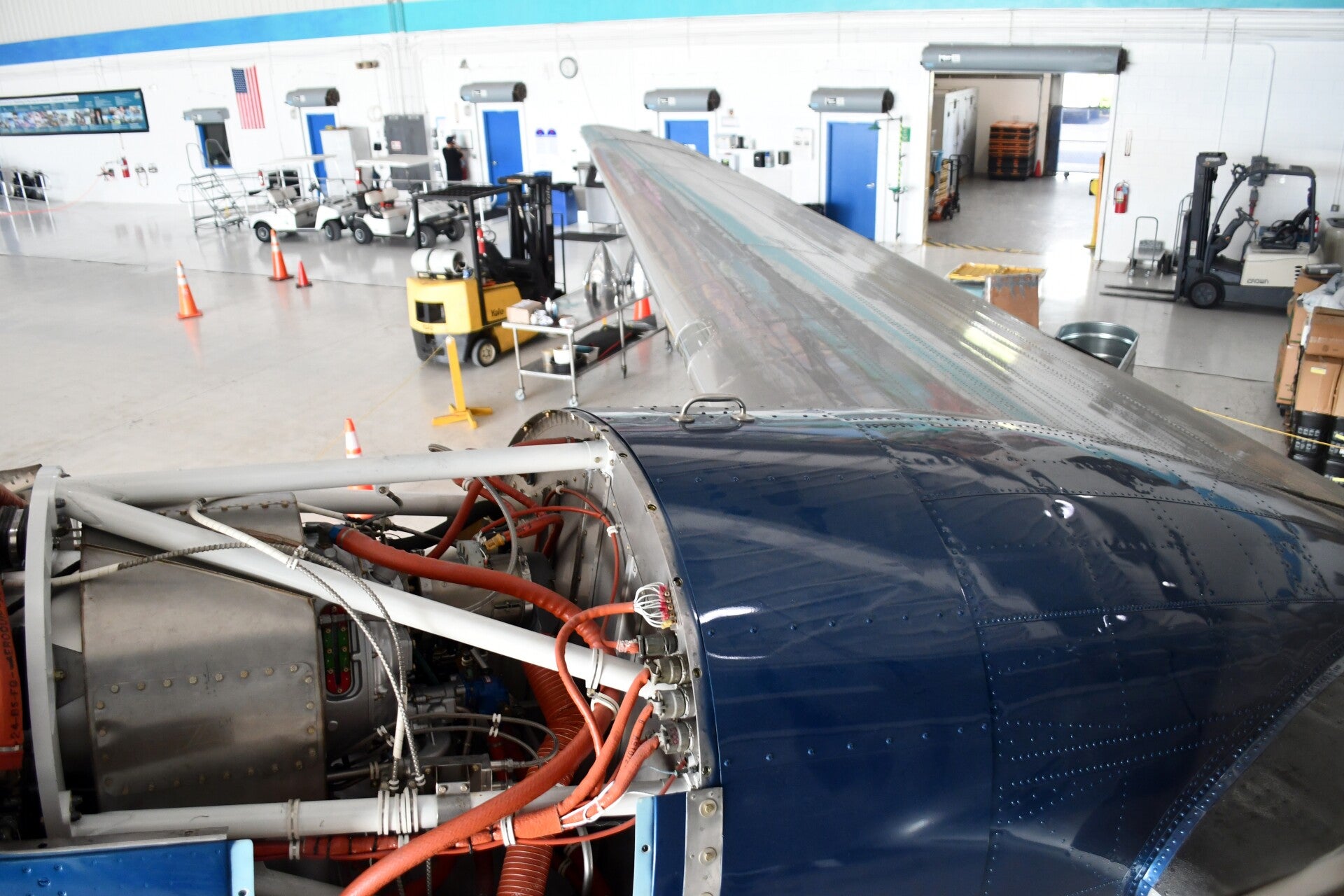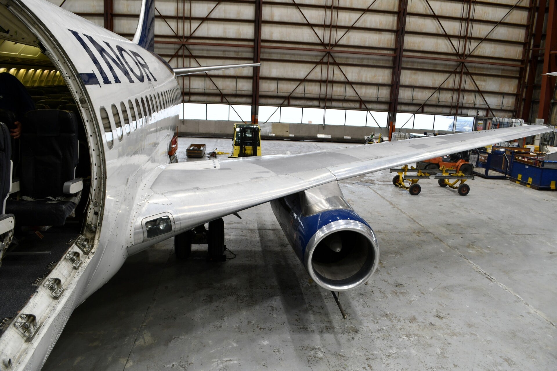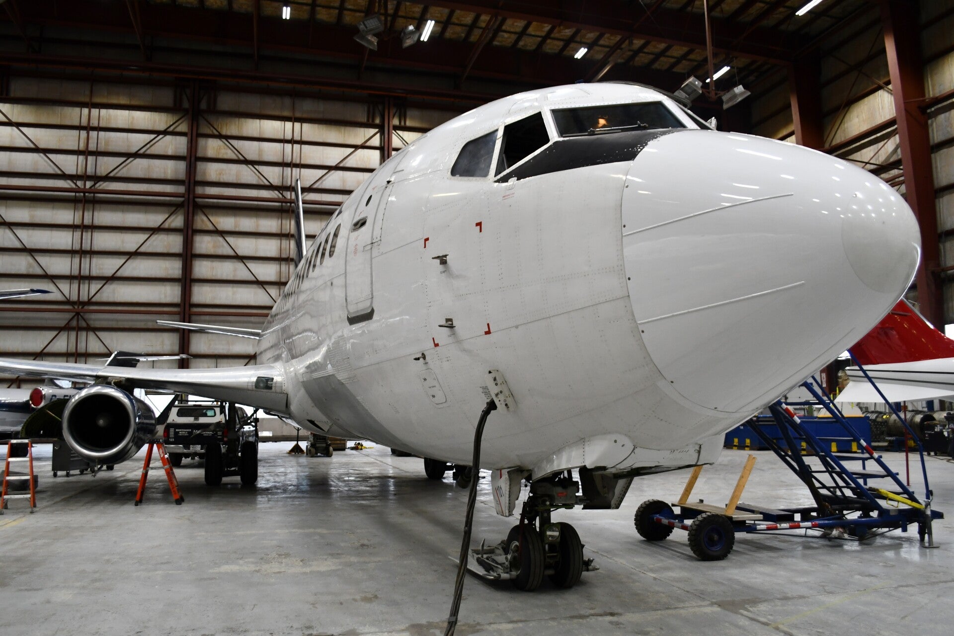 Our next stop is the hangar, where several aircraft are parked: three Boeing 737s, two Learjets, and the owner's private helicopter, all maintained by a skilled team of engineers. Our main focus is the Boeing 737-200 parked at the back of the hangar. The other -200 is undergoing a C-check, and we’re kindly asked to keep a respectful distance. Another aircraft, a 737-400 is parked to the far left of the hangar. It is one of the larger types in Nolinor’s fleet. Their largest fleet members are the Boeing 737-800s, operated by OWG, Nolinor’s commercial division. We even saw an OWG aircraft departing just as we arrived this morning, good timing!