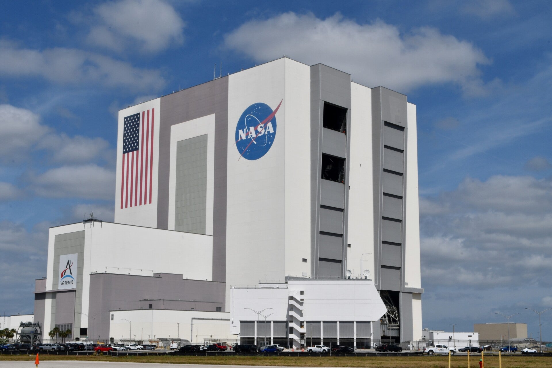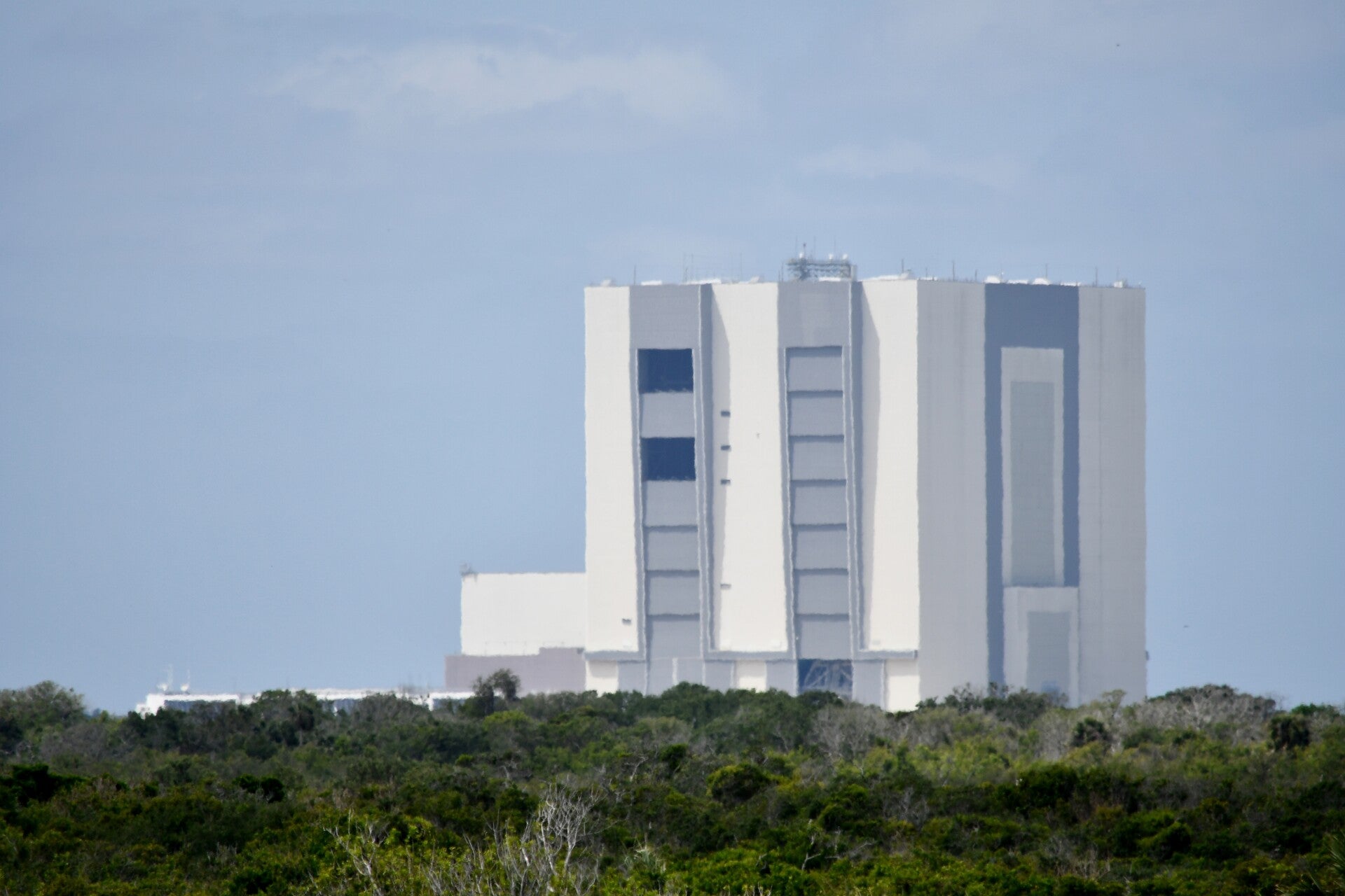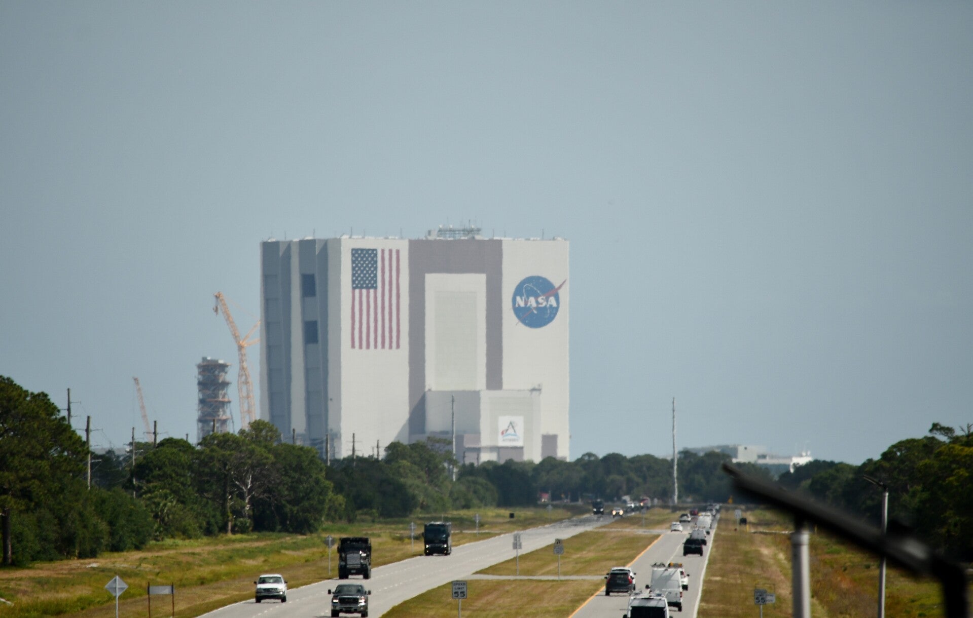 Once everyone has taken their shots, the driver continues the route. Our next stop: the legendary VAB, the Vehicle Assembly Building. This is the largest single-story building in the world and has been used to assemble all of NASA’s major rockets, including the mighty Saturn V. Today, the building houses the next big rocket for the Artemis mission, NASA’s upcoming return to the Moon.