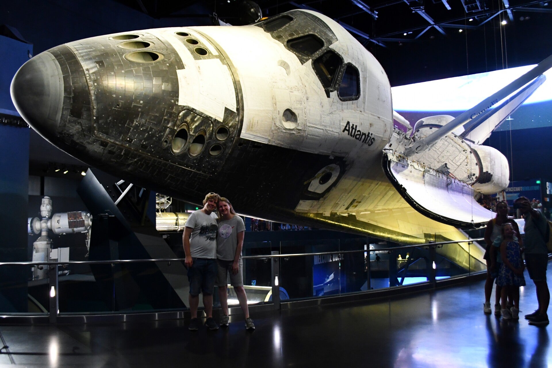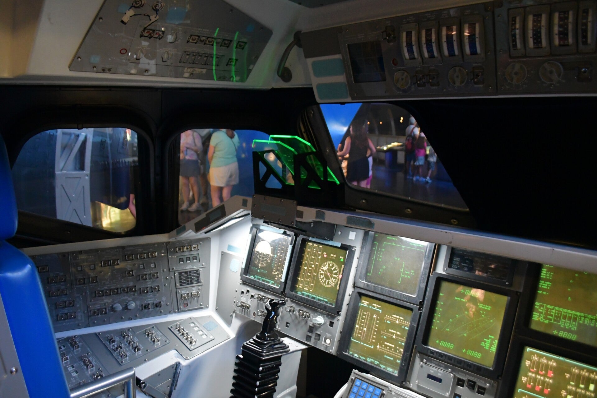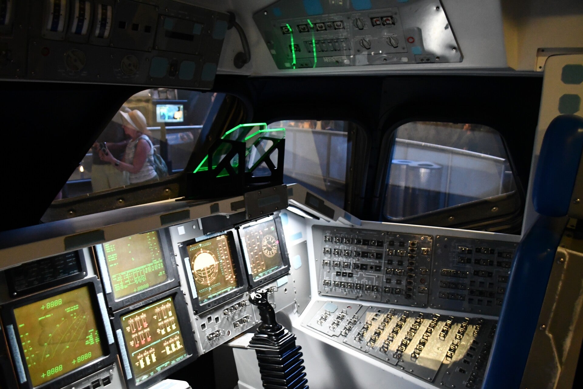 We continue exploring the exhibit hall. It’s masterfully done. There’s a realistic cockpit mock-up where you can sit in the commander’s or pilot’s seat (there is no co-pilot on the Shuttle). Interactive displays let kids, and adults, train, launch, and work from the Shuttle or the ISS. One of the highlights is a launch simulator. Even with a long wait, it’s absolutely worth it.