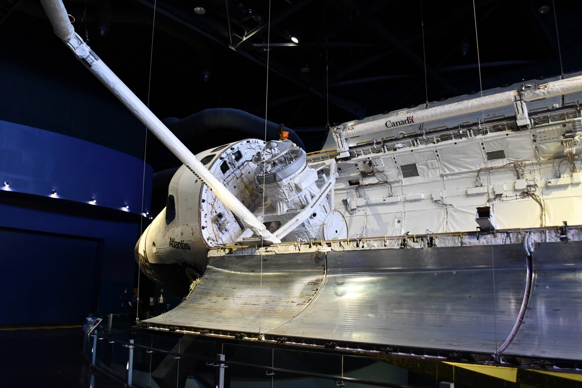Now in orbit, the Shuttle opens its cargo bay doors. As the orbiter hovers above Earth, its robotic arm extended, the film ends. The screen lifts to reveal the real star of the show: OV-104 Atlantis, the orbiter that flew the final Space Shuttle mission. The moment is truly unforgettable.