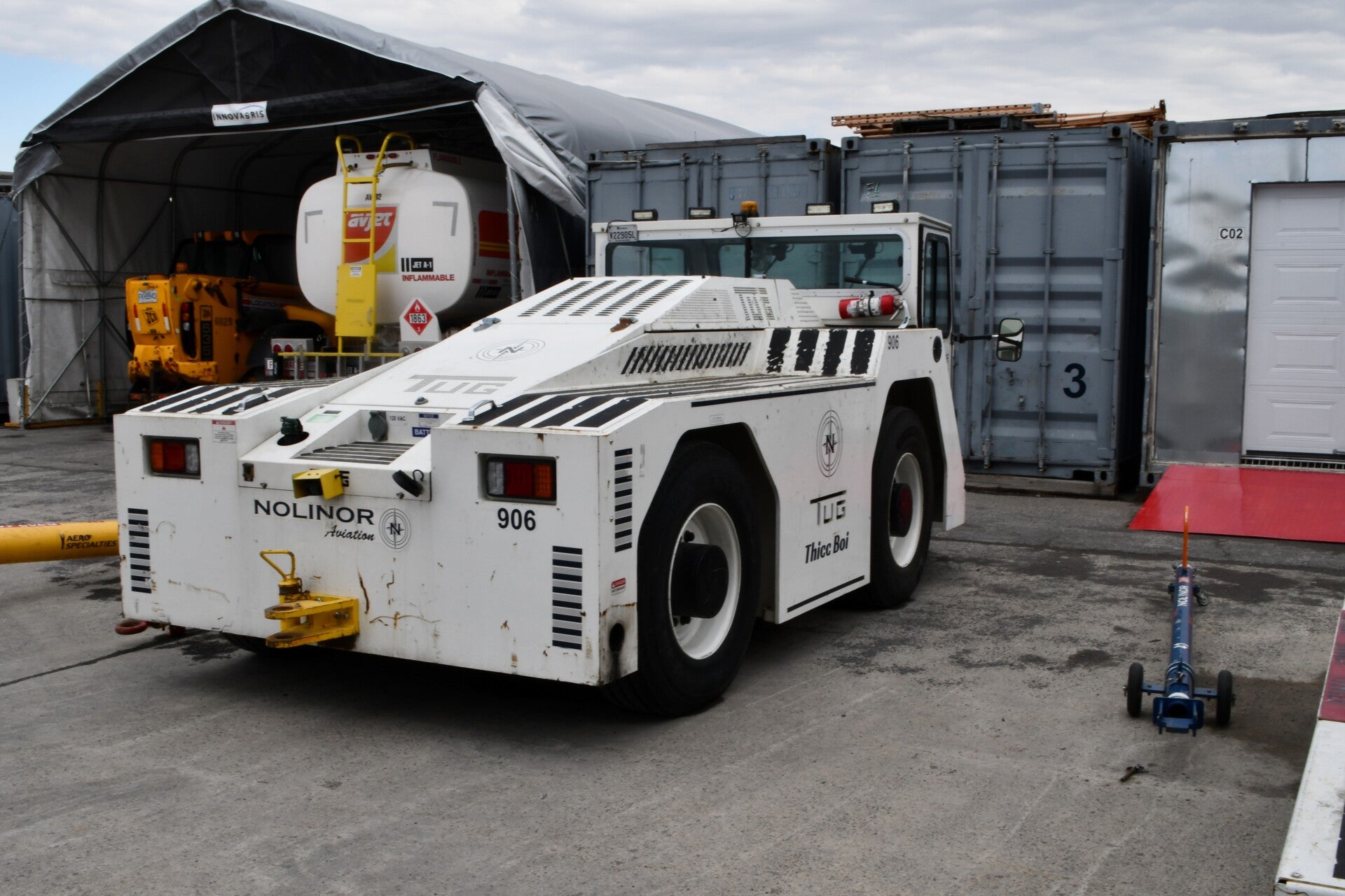 After drooling around in the hangar it is time to take a look outside. Here we see two Cessna 172s what are being used for flight training. One of them is the original Cessna that was owned by the founder of Nolinor. Also the pushback tug called "Thicc Boy" is parked here. Then, we find another Boeing 737-200, registered as C-GTUK. This 737-200 has several cockpit modifications, with the most noticable being four digital screens as primary flight display. This aircraft is also in a full-pax configuration, which means that there are currently no cargo positions available and the entire cabin is for passenger seating. Also clearly visible is the gravel deflector on the nose gear.