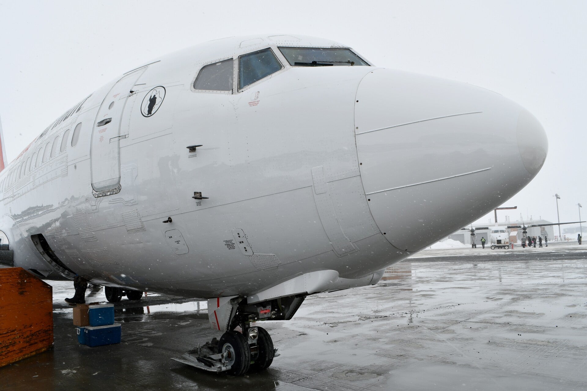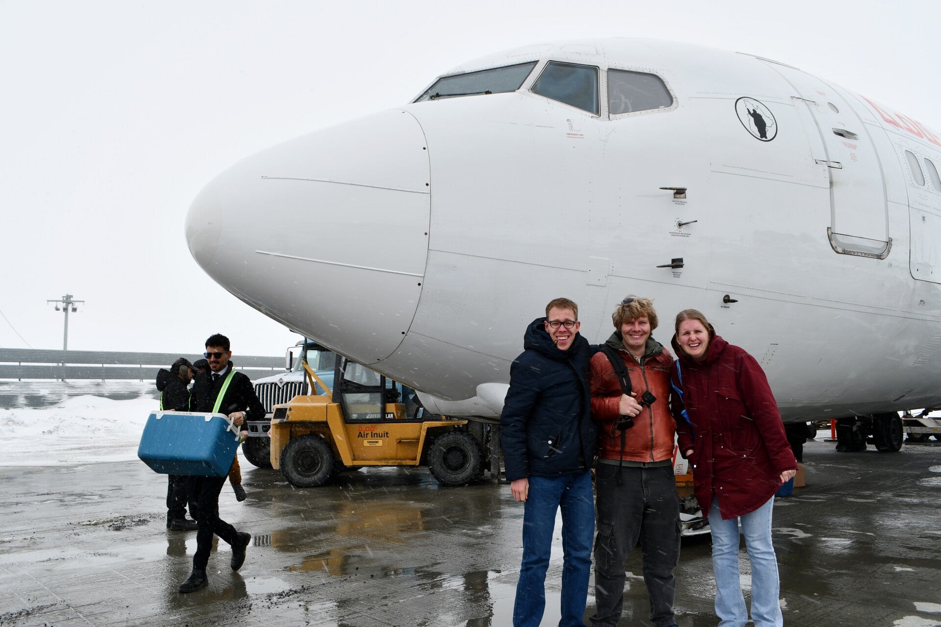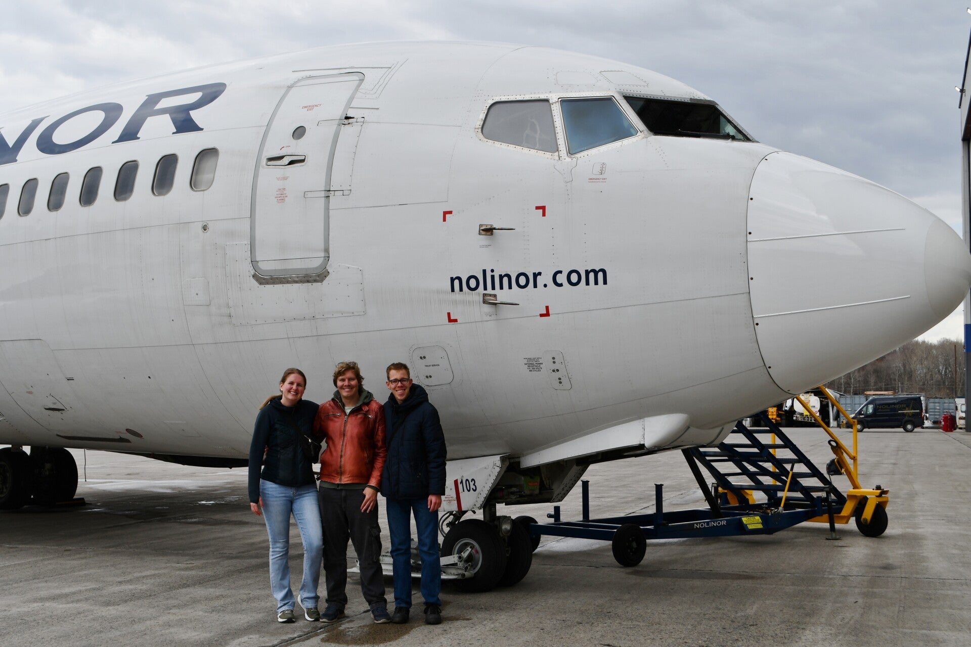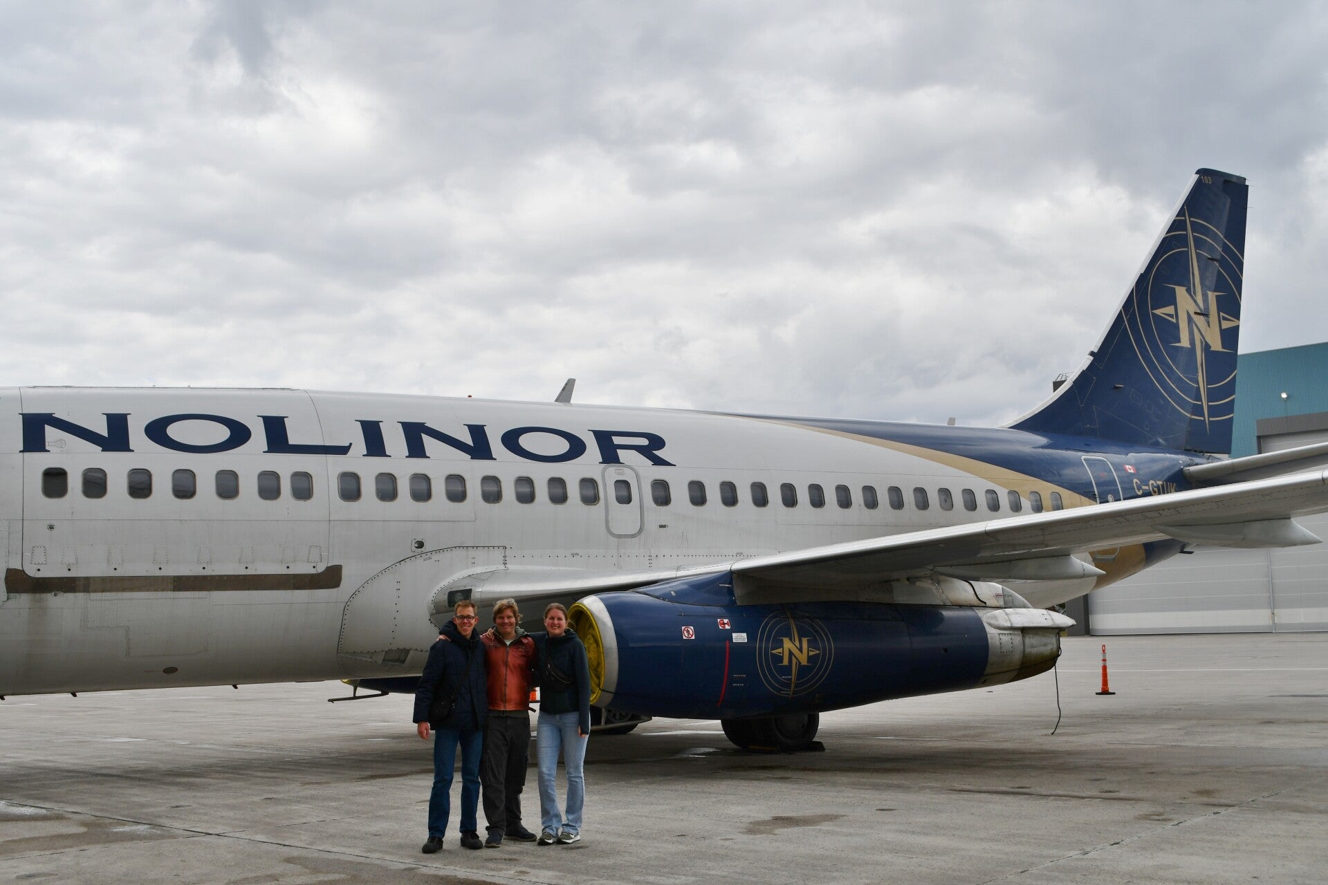 From there, we walk around one of the engines and head toward the aircraft’s nose. Of course, this calls for a group photo session, first with just the three of us, then with Lewis joining in. There’s something incredibly special about standing in front of a gravel-kit-equipped jurassic 737 in the Nunavik region, smiles frozen on our faces (literally and figuratively), commemorating this wild aviation adventure.