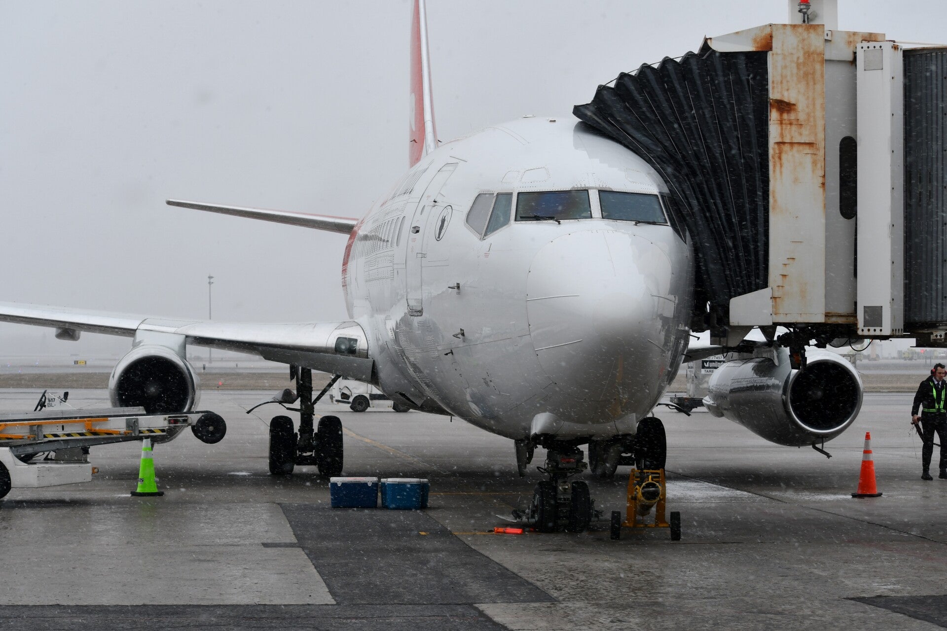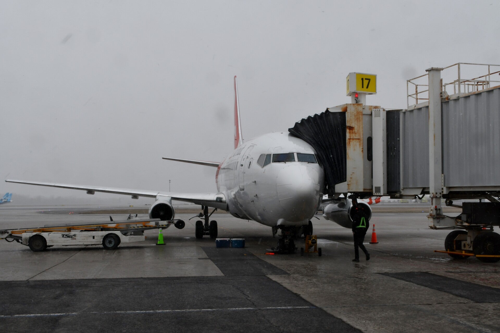 We head through security, grab a quick breakfast, and settle in with a view of the ramp. Everything is moving smoothly. The sky is grey, and soon snowflakes begin to fall, but honestly, it just adds to the cozy, wintry vibe. We even spot a Canadian North Boeing 737-400 Combi parked nearby. What a beauty!