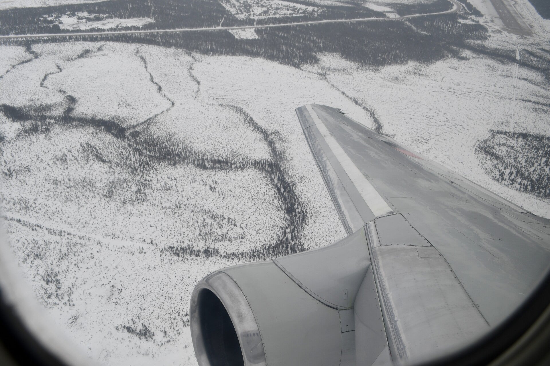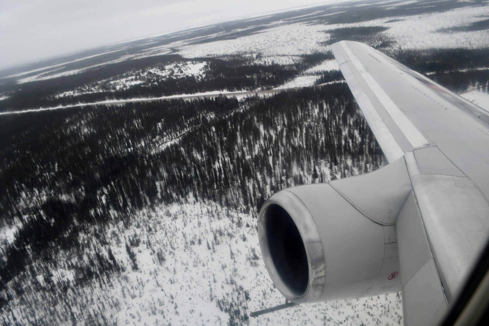 We experience a short delay due to a faulty fuel cap. A replacement needs to be found, but thankfully, it’s nothing serious. Once the issue is resolved, the engines roar back to life, and we taxi out to runway 31. This takeoff feels noticeably different from our departure in Montréal. The runway here is shorter, so the pilots have to apply full thrust much more aggressively. The engines spool up, and we launch forward. Rotation happens quickly, and we’re treated to an incredible view of the endless boreal forest. Black trees poking through the snow like dark brushstrokes across a white canvas. Moments later, we make a right hand turn and punch back through the clouds.