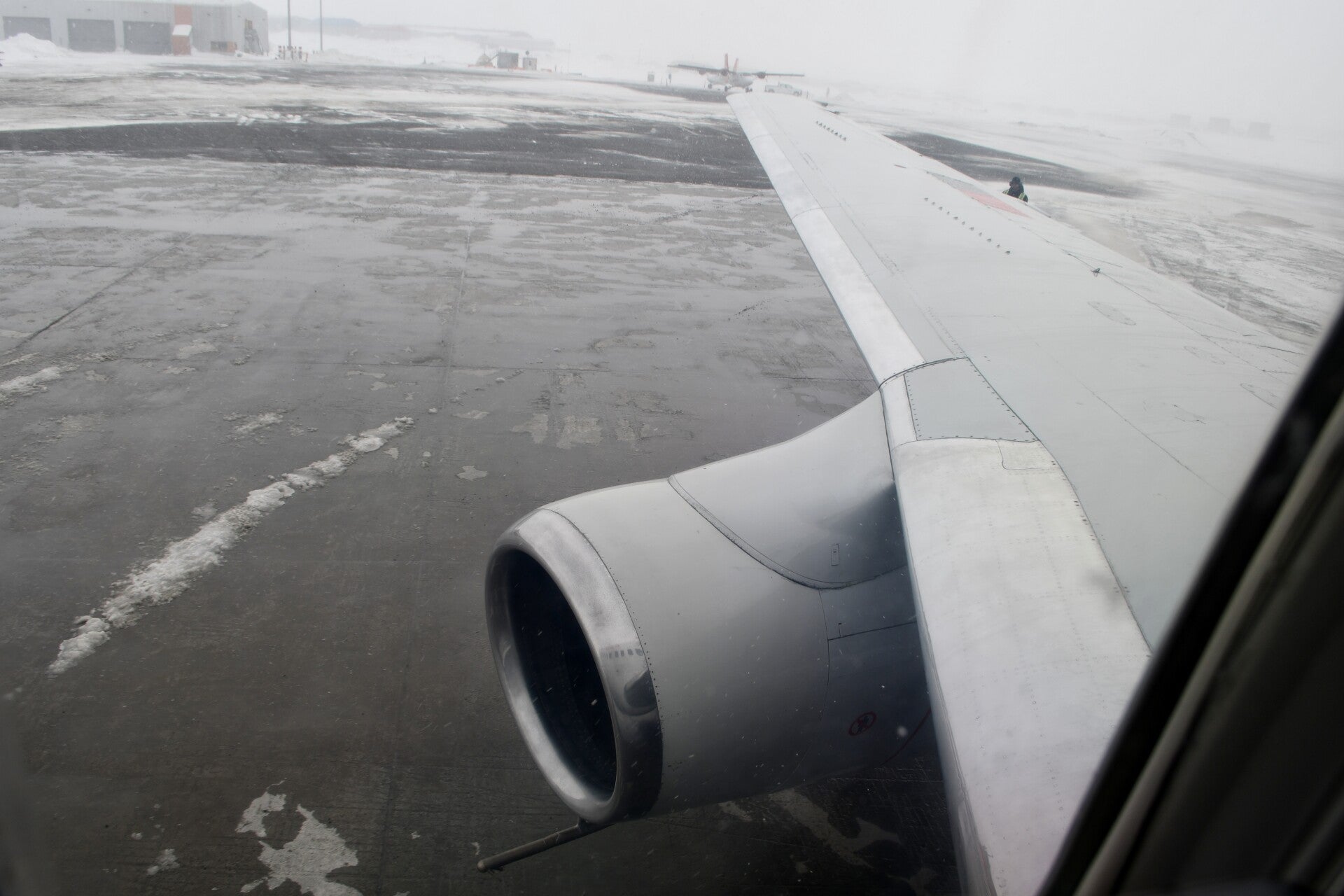 Our first stop today is the deicing pad. First, our wing is sprayed down with a Type-I fluid to remove the snow and ice. Then, a nice layer of protective Type-IV anti-icing fluid is applied which covers the wing and engine in a layer of green stuff. Luckily, our seat is forward of the engines, so our view stays mostly clear. Poor Rudi, though, is stuck in 10F, right over the wing at the emergency exit. His entire view is now neon green!