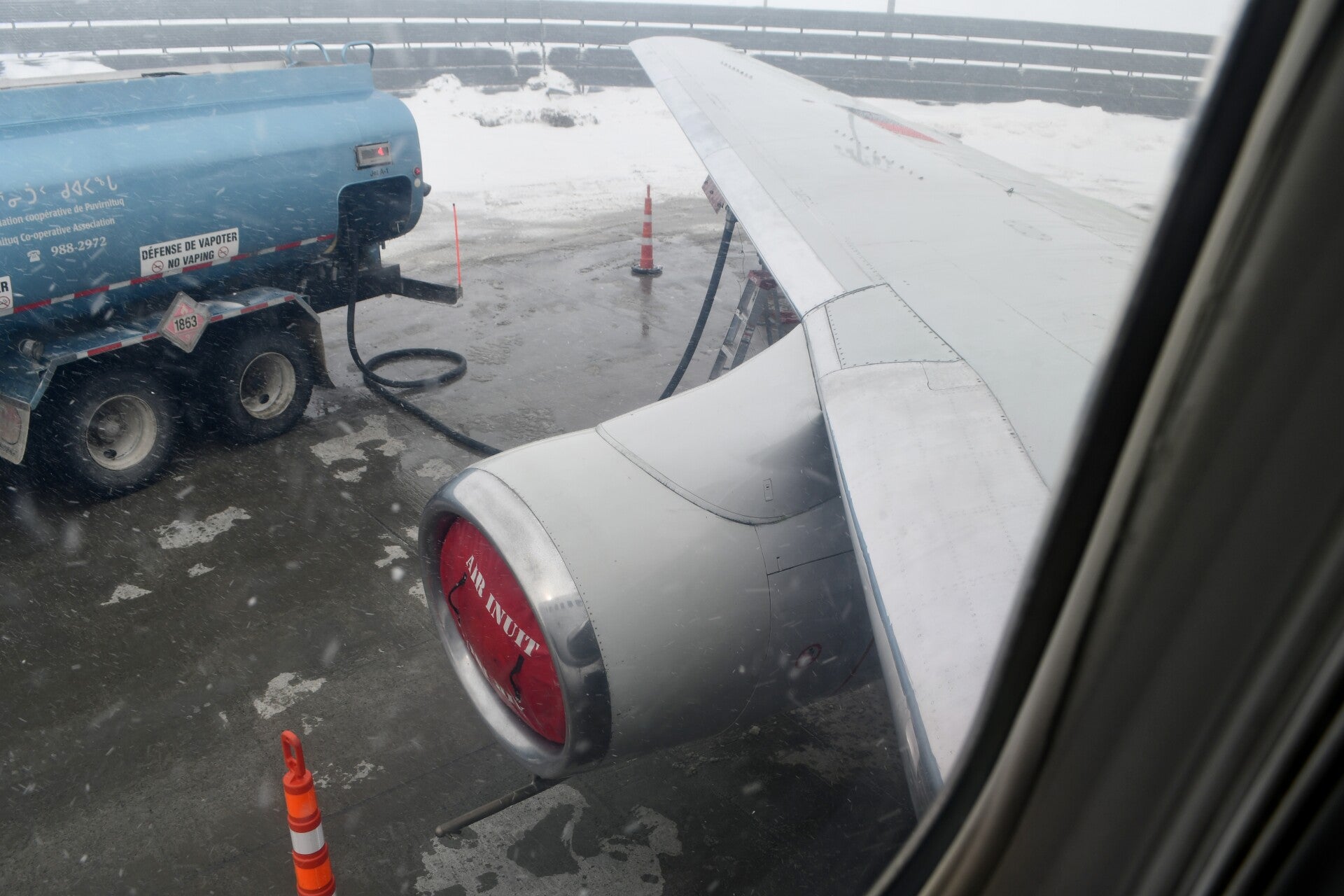At the gate, we also meet Lewis, a fellow passenger and aviation enthusiast who, like us, booked this itinerary just for the 737-200. As we wait for boarding, we enjoy the view of our aircraft being prepared and chat with a few other passengers, many of whom are Air Inuit crew commuting to La Grande or Puvirnituq to fly out on the Dash or Twin Otter.