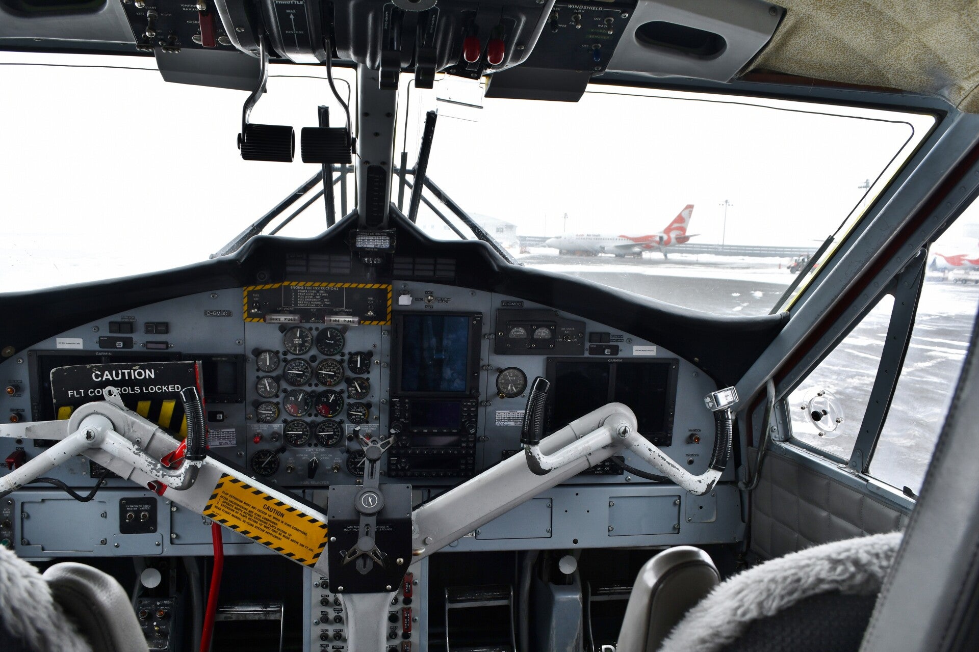 After exploring the Twotters, we brave the freezing wind and continue to a recently arrived DHC-8-300. It had landed while we were busy inside the Twin Otter. We get a quick peek inside and snap a few photos before the crew begins securing the aircraft.