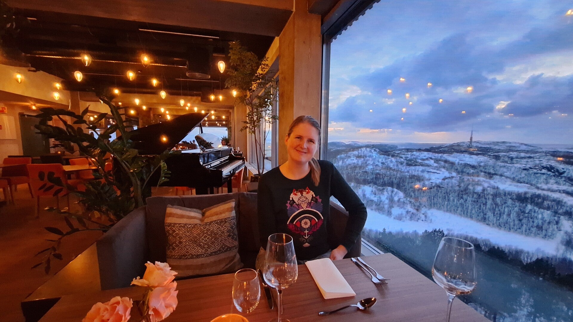 As the sun begins to set, we head back to the car and drive back to Bodø, where we first explore a large shopping mall near the airport. In the evening, we go out for dinner in the city at a luxury steakhouse by the harbor called Roast. The restaurant is on the top floor of a tall hotel, providing a nice view over the city. After a delicious meal, we return to our beloved Wood Hotel for a relaxing evening in the top-floor spa.